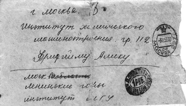 Помнится, на первом курсе — влетает в аудиторию мой приятель Толя и суёт мне под нос извещение о письме. Я не ждал никаких писем и спокойно положил квиток в папку, с которой ходил в институт. Но не тут-то было, Толя буквально каждый час напоминал мне о почте. Я заподозрил, что это розыгрыш с его участием. Под его напором я бездеятельно выдержал только до конца, как сейчас говорят, последней пары и пошёл на почту.